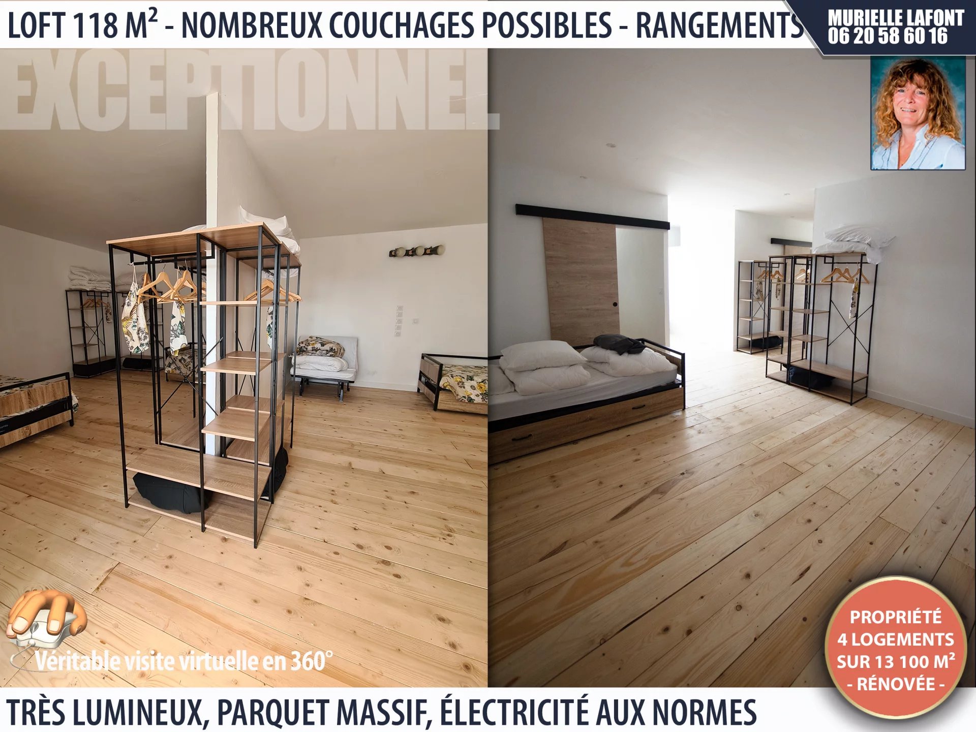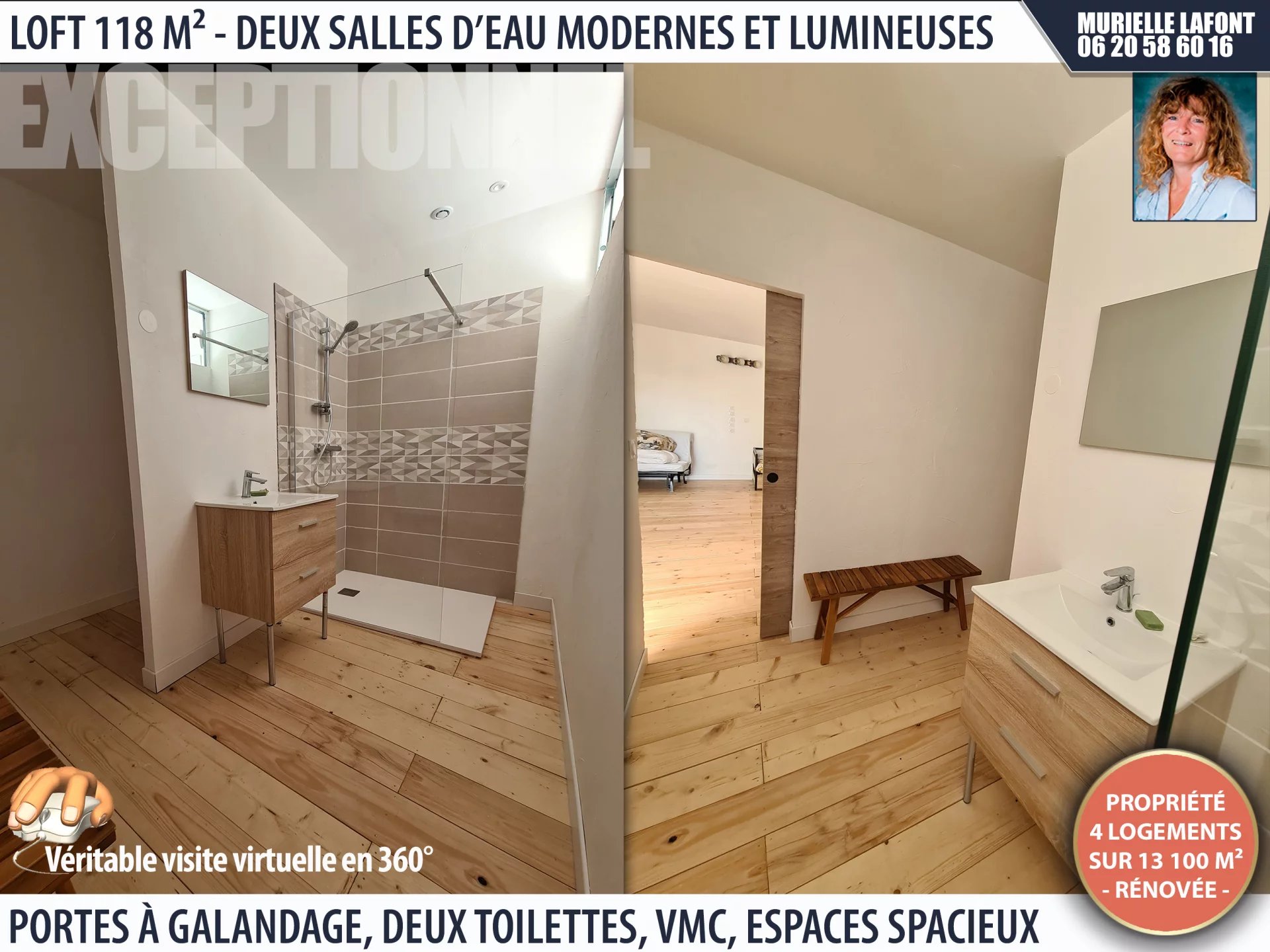 Appartement 1 : Loft moderne de 118 m² avec une grande pièce de vie, cuisine ouverte, immense chambre ouverte avec 2 salles d'eau (douches à l'italienne), 2 WC, climatisation réversible.