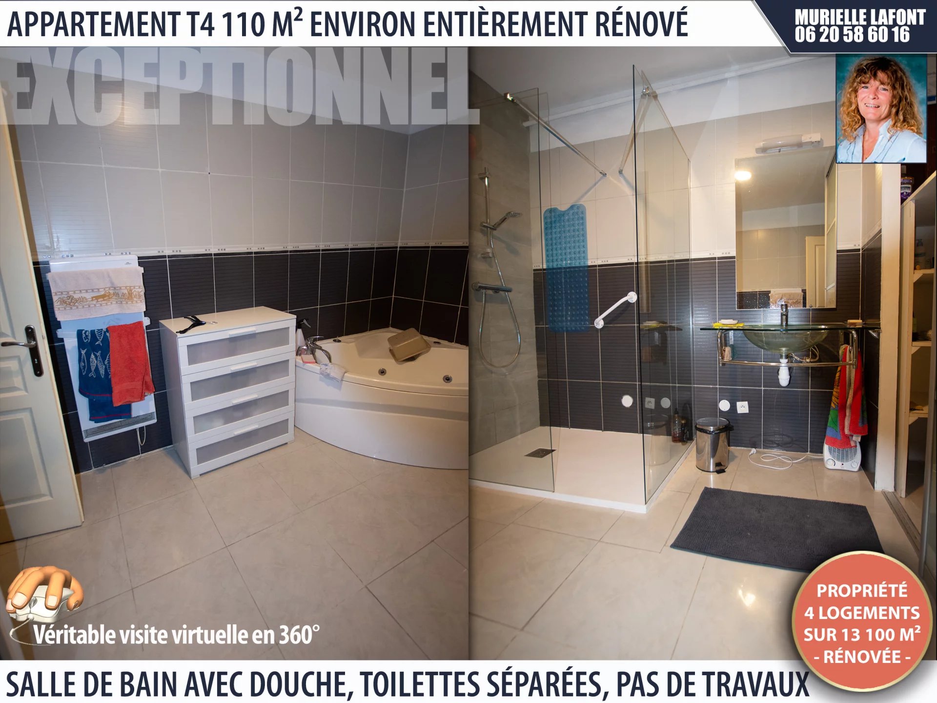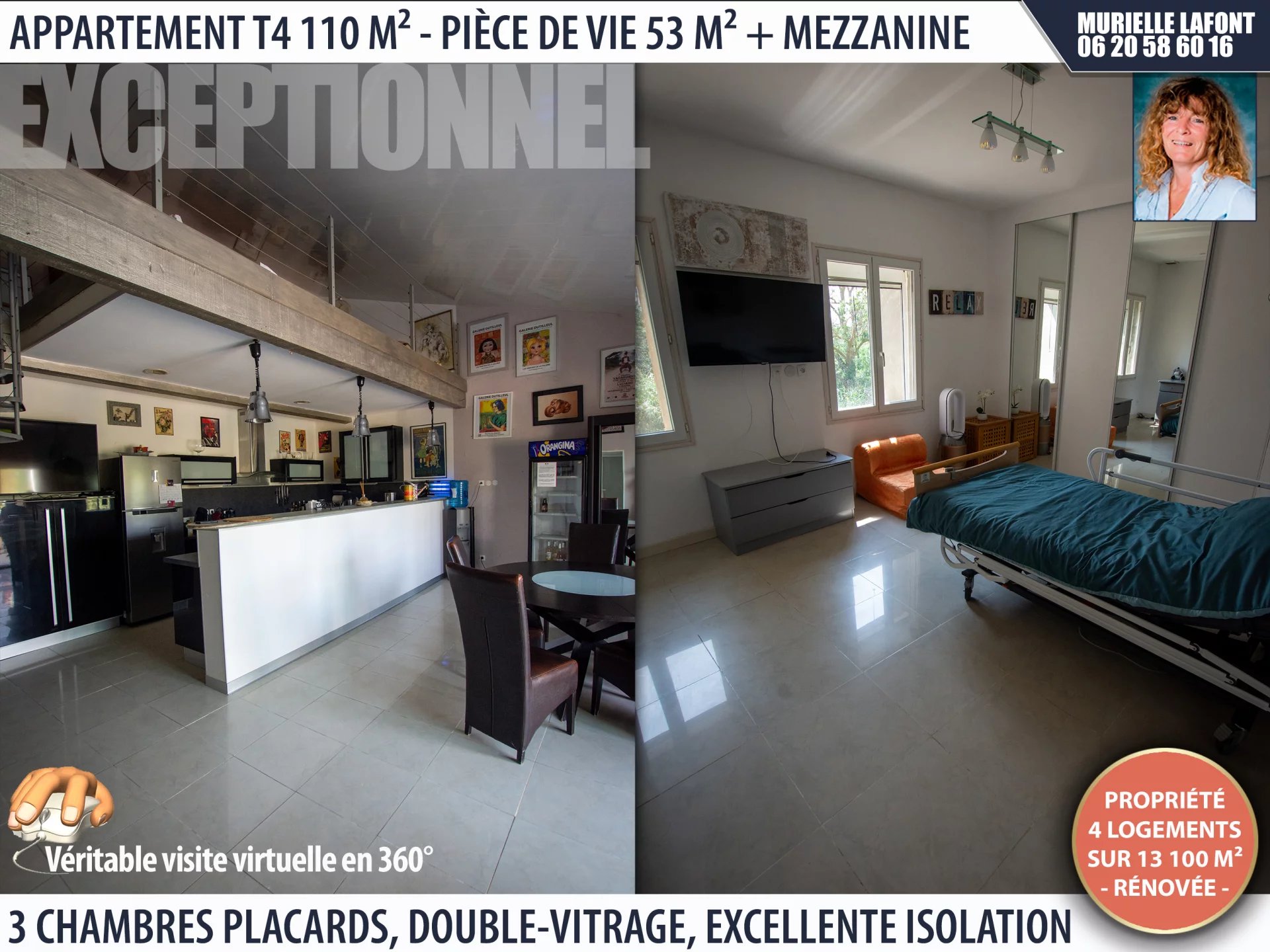 Appartement 2 : T4 de 110 m² avec 3 chambres, mezzanine, cuisine ouverte, salle de bains avec douche à l'italienne, WC séparés, climatisation réversible.