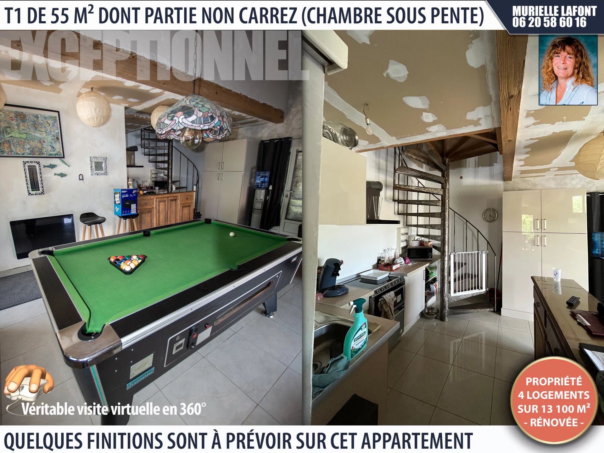 Appartement 4 : T1/2 de 55 m² (non Carrez), avec une pièce de vie, cuisine ouverte, salle d'eau, WC séparés, buanderie, chambre avec espace dressing. À rafraîchir/terminer.
