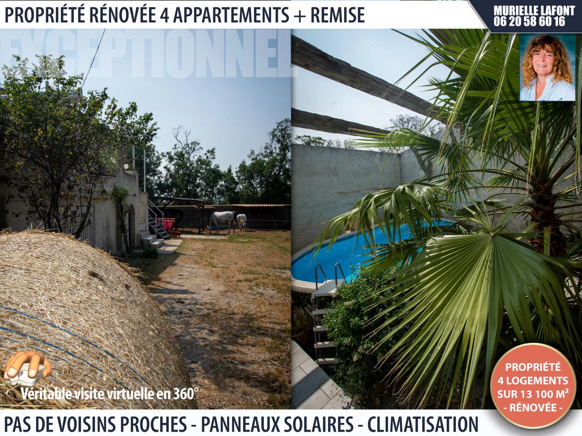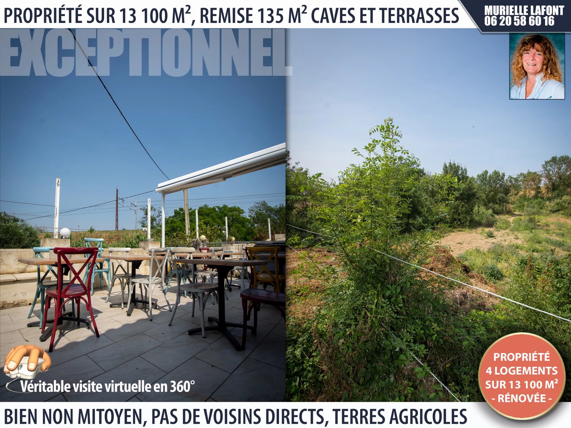 Cette propriété comprend plus d'un hectare (13 100 m²) de terres attenantes, une bâtisse en pierres dotée de 4 logements pour environ 370 m² habitables, de terrasses, d'un accueillant patio de 80 m² équipé d'une grande piscine hors sol, d'une remise (135 m²) et de caves.